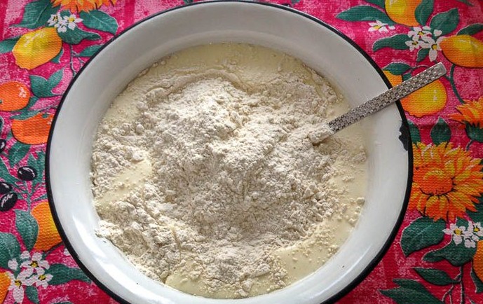 В последнюю очередь подмешать к тесту оставшиеся взбитые белки. Получилось густое бисквитное тесто.