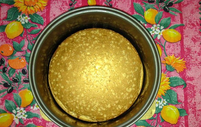 Жаропрочную форму смазать растительным маслом без запаха, посыпать мукой, чтобы готовый бисквит не прилип к стенкам и легко извлекся. Перелить тесто и выпекать бисквит в заранее разогретой до 180С духовке около 50 минут. Первые 20-25 минут, чтобы корж хорошо поднялся и не опал, дверцу духовки не открывать. Готовность коржа можно проверить деревянной зубочисткой: она должны оставаться сухой, после того, как вы опустите её в середину коржа.