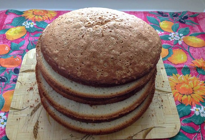 Готовый бисквит остудить при комнатной температуре и разрезать длинным ножом или специальной нитью на 4 одинаковых по толщине коржа.