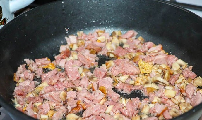 Чеснок пропустить через пресс либо порезать ножом на небольшие кусочки. Выложить чеснок в сковороду с разогретым маслом. Небольшие кусочки индейки и порезанные мелко грибы пересыпать в сковороду. Обжарить до легкого золотистого цвета, не забывая помешивать.