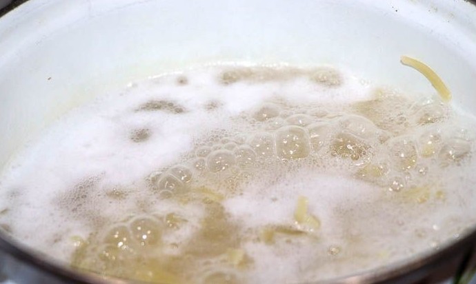 Яичную лапшу отварить в подсоленной воде до готовности. Затем откинуть на дуршлаг, промыть холодной водой, дать жидкости полностью стечь.
