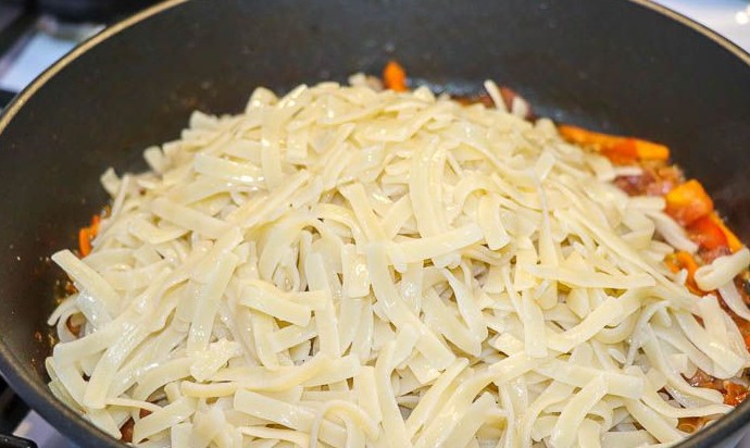 Переложить яичную лапшу из дуршлага в сковороду. Хорошо перемешать. Еще пару минут томить на среднем огне.