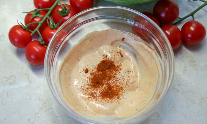Примешать щепотку копченой паприки для придания легкого аромата копчёностей. Всё, соус для салата готов. Оставить его при комнатной температуре, пока будем готовить остальные ингредиенты для салата.