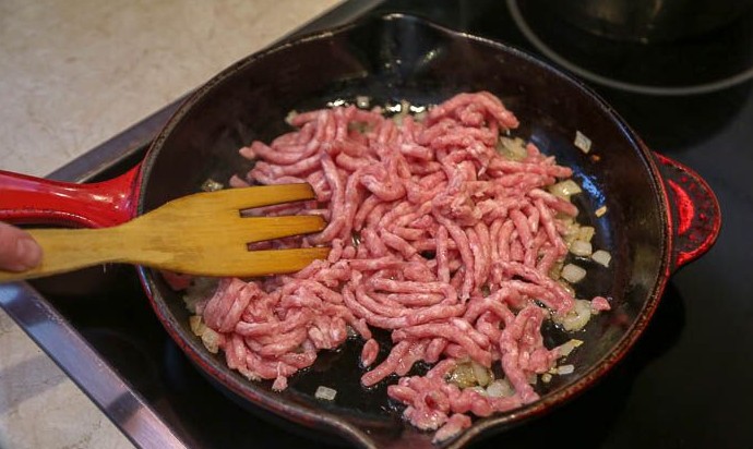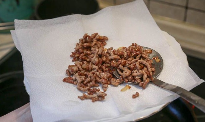 Обязательно переложить обжаренный фарш на бумажное полотенце! Надо убрать лишнее масло из салата, что положительно повлияет на вкус.