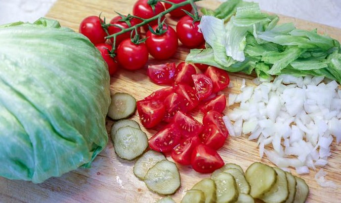 Подготовить овощи. Нарезать огурцы кружочками, помидоры черри - четвертинками, салат айсберг - порвать руками.