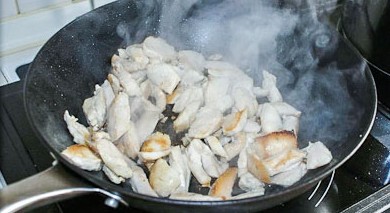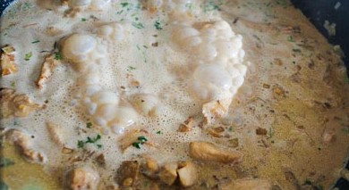 Наливаем сливки, немного соевого соуса, соль, перец. Дадим закипеть.