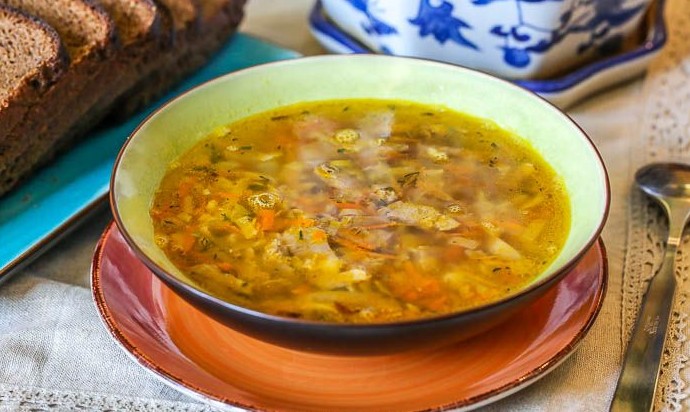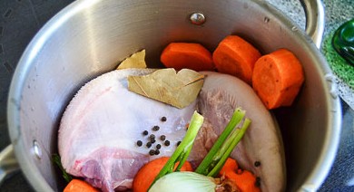 Язык хорошо помыть и сложить в кастрюлю со всеми специями, залить водой, довести до кипения и варить 2-2,5 часа на небольшом огне, посолить минут за 20 до окончания варки. Потом извлечь из бульона, окатить холодной водой, снять шкурку и порезать на немелкие кусочки, толщиной примерно 1-1,5 см.