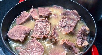 Потом добавить вино и 2 стакана бульона от варки языка, довести до кипения и выложить ломтики языка. Убавить огонь и дать языку немного прогреться в соусе, минут 10.