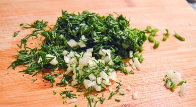 Снова довести соус с языком до кипения, выложить чеснок и зелень, желательно не только порубленные, но и слегка размятые в ступке. Выключить огонь под языком. Ну и можно сразу подавать. Удобно, что язык можно отварить и нарезать заранее, а соус сделать непосредственно перед подачей.