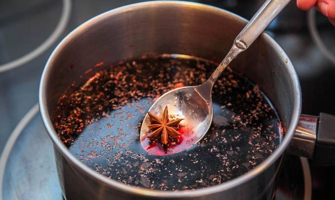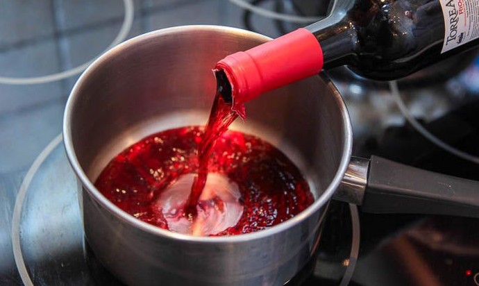 В вино добавить пряности, поставить на огонь и хорошо прогреть, не доводя до кипения.