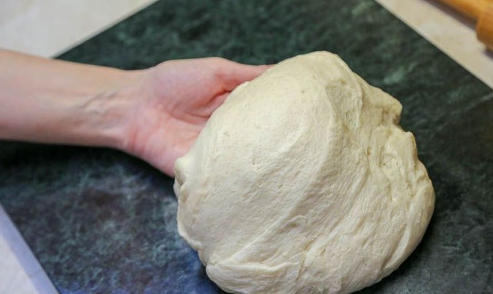 Готовое тесто переложить на смазанную растительным маслом рабочую поверхность, для удобства разделить на 2 равные части. Половину теста вернуть в миску, накрыть пищевой пленкой, пока вы будете заниматься оставшейся частью теста.
