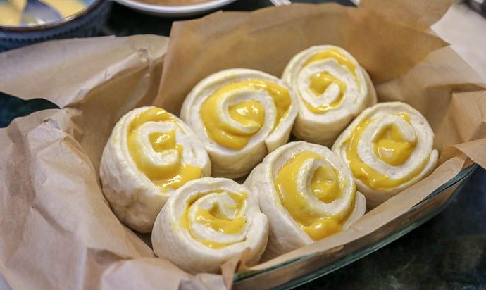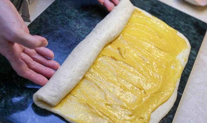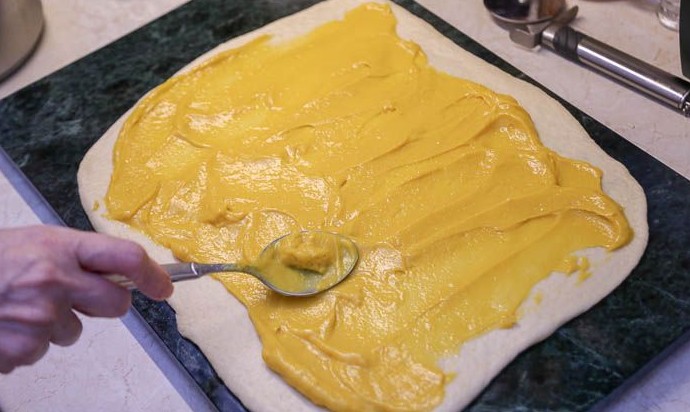 Распределить по тесту заварной тыквенный крем, оставляя свободными примерно 2 см по длинной стороне прямоугольника. Начинки должно быть столько, чтобы она не вытекала при выпечки. Поэтому не стремитесь использовать весь крем. Лучше после разложить его на синнабоны сверху.