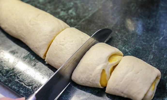 Разрезать рулет на отрезки шириной 3-4 см. Удобно проделывать это ножом, смоченным в воде. Из одного рулета выходит 8 булочек.