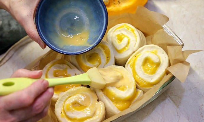Сегодня печем очень мягкие булочки синнабоны. Внутри у них нежный заварной крем с добавлением тыквы. Если хотите, можно посыпать их молотой корицей с коричневым сахаром – так будет еще вкуснее! Для приготовления вам потребуется: для теста: мука - 600г дрожжи сухие (быстродействующие) - 10г молоко (теплое) - 250 мл масло сливочное - 70г сахар - 100г яйцо - 2 шт. ванилин - на кончике ножа соль - 1 ч.л. (без горки) заварной тыквенный крем: тыква очищенная (сладкая, сорт «Оранжевое солнце») - 350г молоко - 250г яйцо - 1 шт. крахмал кукурузный - 12г сахар коричневый - 100г масло сливочное - 20г желатин - 1 ч.л. вода (для желатина) - 2 ст.л. для посыпки: корица (молотая) - 1 ч.л. сахар коричневый - 1-2 ч.л. Рецепт : Заварной тыквенный крем удобнее приготовить заранее. Подробный рецепт я показывала здесь. Замесить тесто для булочек. За основу взяла рецепт теста для синнабонов. Его замешивают с растопленным сливочным маслом. Примерно через 1.5 часа расстойки тесто увеличится в объеме 2-2.5 раза. Подробный рецепт можно посмотреть здесь. Для посыпки смешать в небольшой миске коричневый сахар и молотую корицу. Если нет коричневого, берите обычный. Готовое тесто переложить на смазанную растительным маслом рабочую поверхность, для удобства разделить на 2 равные части. Половину теста вернуть в миску, накрыть пищевой пленкой, пока вы будете заниматься оставшейся частью теста. Из второй половины раскатать скалкой прямоугольник размером 25х30 см. Кстати, можно раскатать тесто на пищевой пленке, легче будет скатывать рулет. Распределить по тесту заварной тыквенный крем, оставляя свободными примерно 2 см по длинной стороне прямоугольника. Начинки должно быть столько, чтобы она не вытекала при выпечки. Поэтому не стремитесь использовать весь крем. Лучше после разложить его на синнабоны сверху. По желанию присыпать крем смесью корицы с сахаром. Я этого делать не стала, чтобы корица не перебила вкус крема, и я смогла в полной мере распробовать в синнабонах крем. Свернуть тесто с кремовой начинкой, начиная с длинной стороны прямоугольника. Если раскатывали тесто на пленке, то скручивать рулет будет проще: достаточно приподнять длинный край пленки и тесто само начнет скручиваться под своим весом. Разрезать рулет на отрезки шириной 3-4 см. Удобно проделывать это ножом, смоченным в воде. Из одного рулета выходит 8 булочек. Жаропрочную форму с высокими бортиками (прямоугольную, квадратную или круглую) смазать растительным маслом или застелить пекарской бумагой, перенести в форму булочки, установив срезом вверх, оставляя между ними расстояния 2-3 см. Накрыть форму пленкой и поставить для расстойки в теплое место на 1-1.5 часа, чтобы они хорошо поднялись и увеличились в размере минимум в 2 раза. Перед постановкой булочек в духовку, смазать их по макушкам смесью желтка с молоком и посыпать корицей с сахаром. Разогреть духовку до 180С и выпекать булочки примерно 40 минут. Ориентируйтесь по своей духовке! Если вы сомневаетесь в готовности булочек, достаньте одну, постучите по дну - у готовой булочки звук будет гулкий, пустой. Форму с готовыми синнабонами достать из духовки. Дать им отдохнуть в форме 10 минут, после чего щедро промазать оставшимся заварным тыквенным кремом. По желанию украсить синнабоны молотой корицей с сахаром или сахарной пудрой. Синнабоны с заварным тыквенным кремом готовы. Приятного аппетита