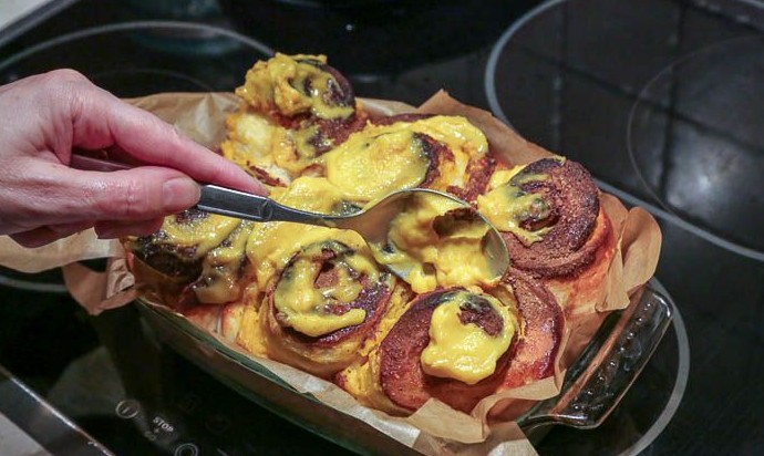 Форму с готовыми синнабонами достать из духовки. Дать им отдохнуть в форме 10 минут, после чего щедро промазать оставшимся заварным тыквенным кремом. По желанию украсить синнабоны молотой корицей с сахаром или сахарной пудрой. Синнабоны с заварным тыквенным кремом готовы. Приятного аппетита!