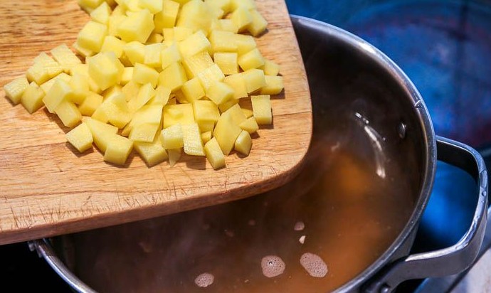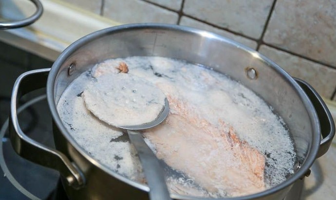 Тушку лосося очистить от чешую, выпотрошить, отрезать плавники. Рыбу порезать на кусочки. На бульон взять част хвоста и голову (из головы обязательно вырезать жабры). Отправить лосося в кастрюлю с холодной водой и поставить на сильный огонь. Как только вода начнет закипать, уменьшить нагрев до минимально и продолжать варить, снимая пену.