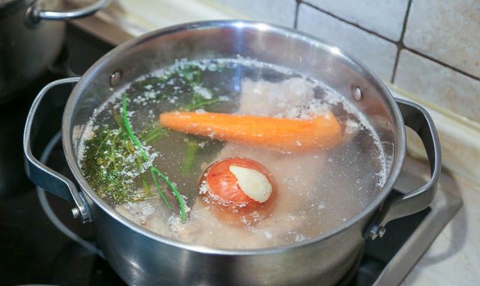 Когда пена перестанет образовываться, посолить, положить в кастрюлю с бульоном зелень, целую очищенную морковь и целую луковицу (можно в шелухе, но обязательно помыть луковицу). Продолжить варить на слабом огне 1 час.