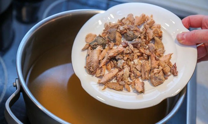 Из готового бульона выбросить луковицу, зелень и морковь. Бульон процедить и вернуть в кастрюлю кусочки вареного лосося (без костей).