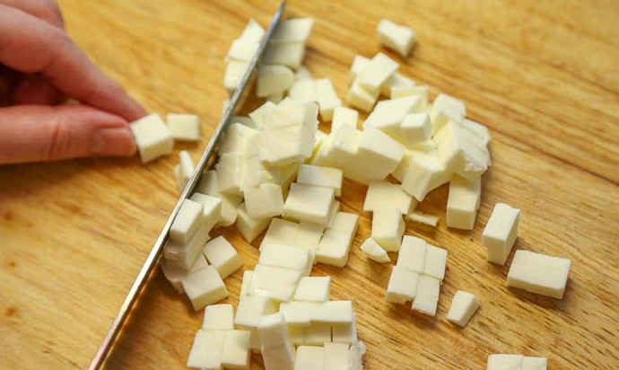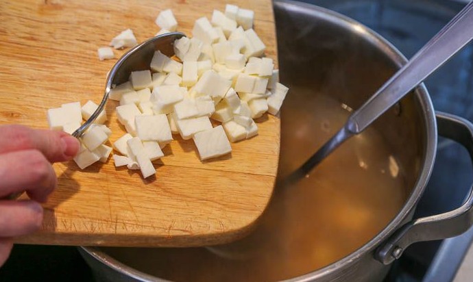 Плавленый сырок для супа нарезать маленькими кубиками.