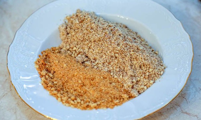Приготовить посыпку для украшения торта из измельченных в блендере обрезков медового теста и поджаренных на сухой сковороде грецких орехах.