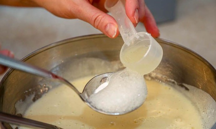 Добавьте в яично-сахарную массу мед (если он твердый, то сначала растопить его на водяной бане). Затем влить гашеную лимонным соком соду и растопленное сливочное масло.
