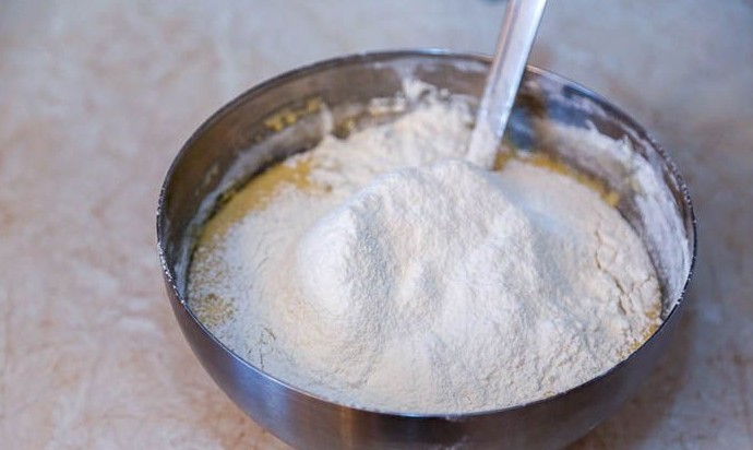 Размешать и засыпать просеянную муку. Перемешать и поставить кастрюлю с тестом на водяную баню.