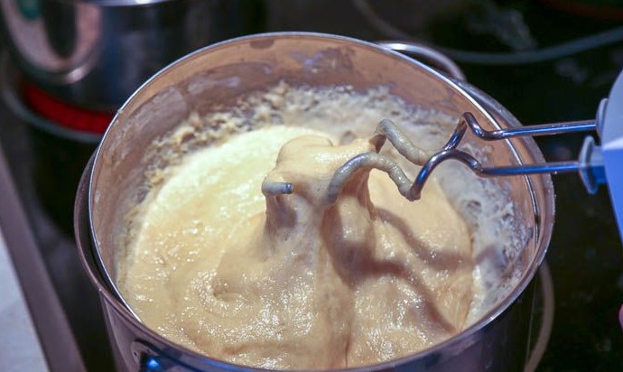 Заваривать медовое тесто на водяной бане 30-40 минут, часто помешивая, чтобы не образовывалось комков. Я простояла над этим тесто 30 минут, лишь изредка выключая миксер, потому что как только я переставала размешивать тесто, на дне миски сразу образовывались комки.