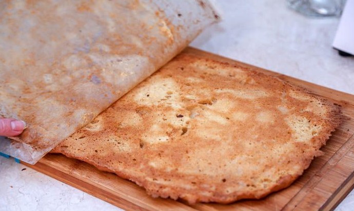 Каждый корж выпекать в предварительно прогретой до 220 С духовке по 4-5 минут. Во время выпечки коржи очень хорошо поднимаются и становятся толщиной не меньше 1 см. Готовый корж переложить на ровную поверхность бумагой вверх и аккуратно стянуть её с готового коржа. Затем подровнять коржи.