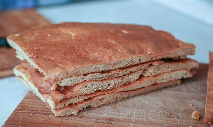 У меня получилось 6 прямоугольных коржей размером 27х19 см в готовом виде.