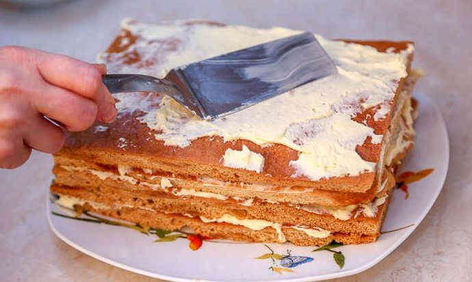 Приготовить заварной крем со сливочным маслом по этому . Каждый слой щедро промазать заварным кремом и уложить друг на друга. Верхний корж пока оставить без крема, а накрыть разделочной доской и поставить небольшой груз, чтобы выровнять поверхность торта.