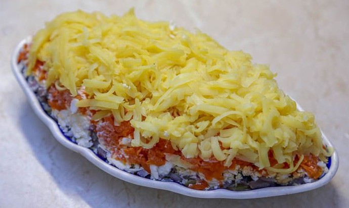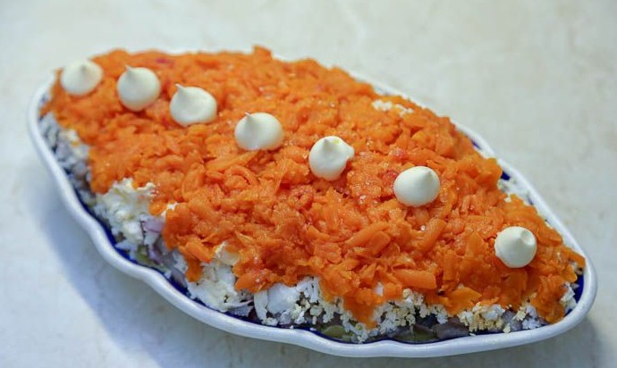На яичный слой распределить морковь, чуть смазать майонезом.