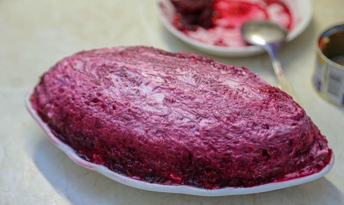 Свеклу немного отжать, чтобы убрать лишний сок. Выложить её последним слоем и смазать майонезом. Оставить слоеный салат сельдь под шубой с икрой минтая в холодильнике на 2-3 часа, чтобы слои пропитались майонезом. Перед подачей украсить салат по своему вкусу. Я наполнила половинку яйца икрой и разместила её на салате. Селедка под шубой с икрой минтая готова. Приятного аппетита!