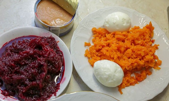 То же самое проделать с морковью и свеклой. Для свёклы выбирайте мелкую тёрку.