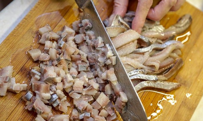 В этот раз мы решили поэкспериментировать с классической сельдью под шубой, обогатив ее икрой минтая. Результат превзошел ожидания: салат обрел новую глубину вкуса, где соленость икры гармонично сочеталась с ее неповторимым оттенком, придавая блюду неожиданную пикантность. Пробуем? Для приготовления вам потребуется: сельдь соленая - 150г икра минтая - 100г картофель - 3 шт. морковь - 1 шт. свекла - 1 шт. яйцо - 2 шт. лук репчатый - 1 шт. (небольшая луковица) майонез - по вкусу соль - по вкусу перец черный (молотый) - по вкусу. Рецепт : Все овощи для салата (картофель, морковь, свеклу) вымыть под проточной водой. Желательно помыть овощи с щеточкой. Сложить в кастрюлю с кипящей подсоленной водой (свёклу варить отдельно). Примерно через 30 минут картофель и морковь будут готовы. Свёкле понадобится больше время на варку – около 40 минут. Яйца варить 10 минут после закипания. Слить с вареных овощей воду, остудить и очистить. Картофель натереть на терке. То же самое проделать с морковью и свеклой. Для свёклы выбирайте мелкую тёрку. Филе сельди порезать мелким кубиком. Репчатый лук нарезать примерно так же, сбрызнуть столовым уксусом. Выложить половину картофеля на дно салатницы. Слегка смазать майонезом. Поверх картофельного слоя распределить селёдку. Посыпать луком. Следующий слой - вареные яйца, тёртые на мелкой тёрке. Смазать их майонезом. На яичный слой распределить морковь, чуть смазать майонезом. Остается сделать второй картофельный слой и щедро намазать икрой минтая. Свеклу немного отжать, чтобы убрать лишний сок. Выложить её последним слоем и смазать майонезом. Оставить слоеный салат сельдь под шубой с икрой минтая в холодильнике на 2-3 часа, чтобы слои пропитались майонезом. Перед подачей украсить салат по своему вкусу. Я наполнила половинку яйца икрой и разместила её на салате. Селедка под шубой с икрой минтая готова. Приятного аппетита!