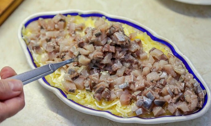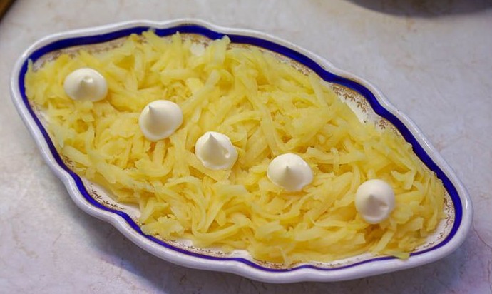Выложить половину картофеля на дно салатницы. Слегка смазать майонезом.