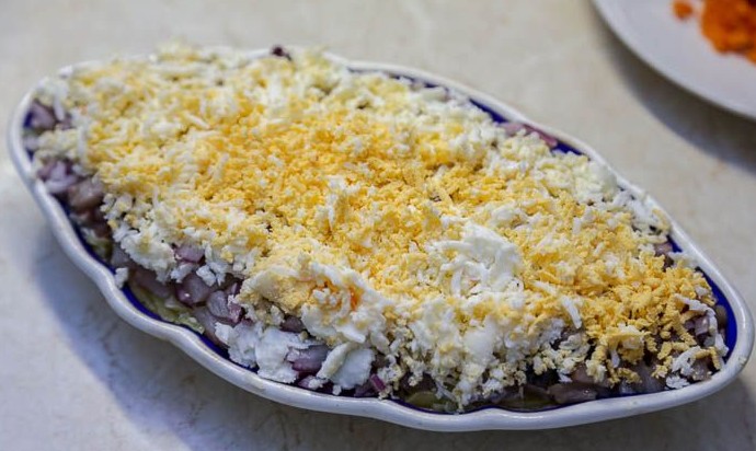 Следующий слой - вареные яйца, тёртые на мелкой тёрке. Смазать их майонезом.