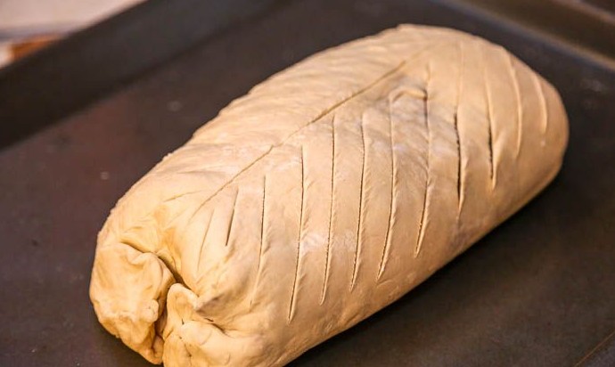 На присыпанной мукой поверхности раскатать листы слоеного теста, чтобы получился прямоугольник по размеру подходящий для мясного рулета. С рулета снять пленку, уложить его на середину прямоугольника из слоеного теста. Тесто вокруг рулета смазать желтком и обернуть вокруг говядины, срезая излишки. Смазать верх и бока рулета в тесте желтком и убрать в холодильник на 15 минут, уложив швом вниз.
