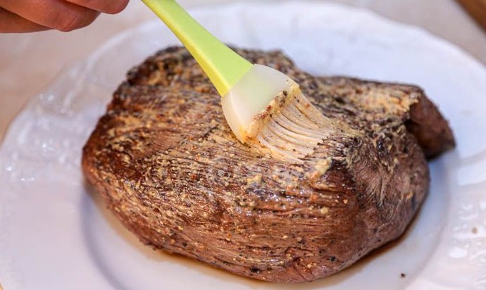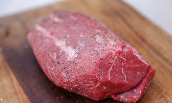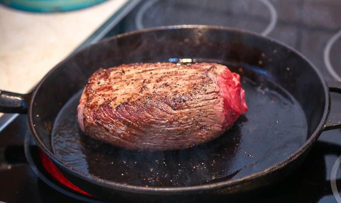 На сковороде разогреть немного растительного масла и обжарить мясо по 30 секунд с каждой стороны. Снять говядину со сковороды и дать немного остыть.