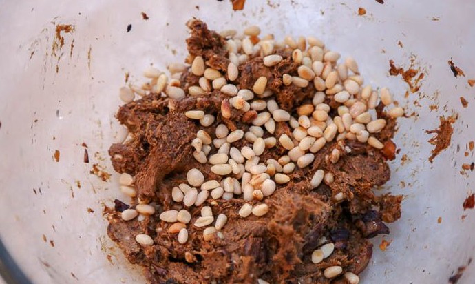 На рабочую поверхность расстелить пищевую пленку, на нее выложить внахлест ломтики ветчины, затем - слой грибного пюре с кедровыми орехами, а на нем по центру положить говядину.