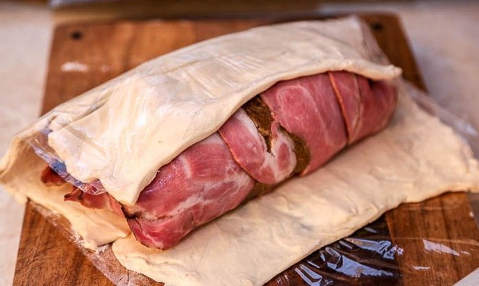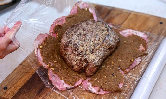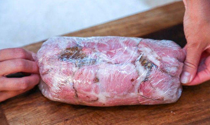 Приподнимая края пленки, обернуть вокруг говядины слой ветчины с грибным пюре и закрепить края пленки, чтобы получился рулет. Убрать его в холодильник на 30 минут.