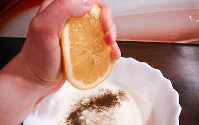 Для соуса нам нужен кефир. Поперченный и посоленный. И выдавим туда лимонный сок (все на вкус).