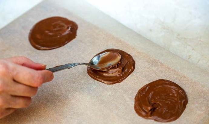 Сначала надо приготовить медальоны из нутеллы, которые и будут начинкой для оладий. Для этого застелить разделочную доску пекарской бумагой и выкладывать на неё 7 кружков Нутеллы примерно по 1-1.5 ст.л. на каждый. Диаметр кружков должен быть около 6 см. Убрать доску с медальонами в морозилку на 1 час. Шоколадная паста должна полностью застыть.