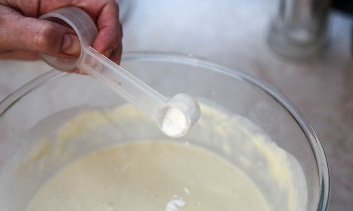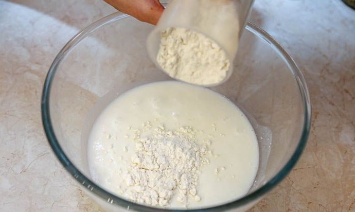 Пока замораживается нутелла, приготовить тесто для оладий. Для этого просеять муку в миску и смешать её с пекарским порошком. Смешать муку с молоком, чтобы не осталось комочков.