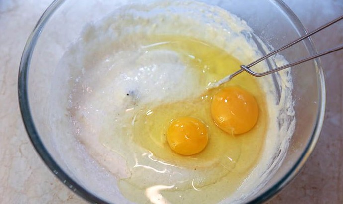 Добавить в тесто для оладий соль и сахар. Снова перемешать.