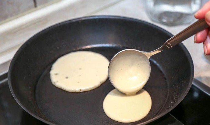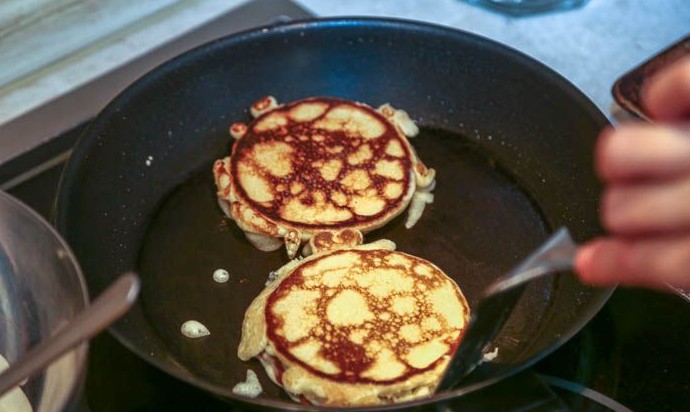 Сковороду с антипригарным покрытием разогреть, смазать растительным или сливочным маслом, а затем протереть бумажным полотенцем. Снизить нагрев до среднего. Налить на сковороду теста для 2-3 оладий и дать им пропечься примерно 30 секунд.