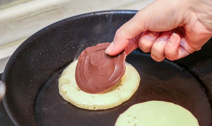 Как только тесто на поверхности оладий слегка схватится, достать из морозилки 2-3 (в зависимости от числа оладий на сковороде) замороженных медальона из нутеллы (они легко отделяются от бумаги) и положить их на оладьи. Остальные медальоны должны оставаться в морозилке!