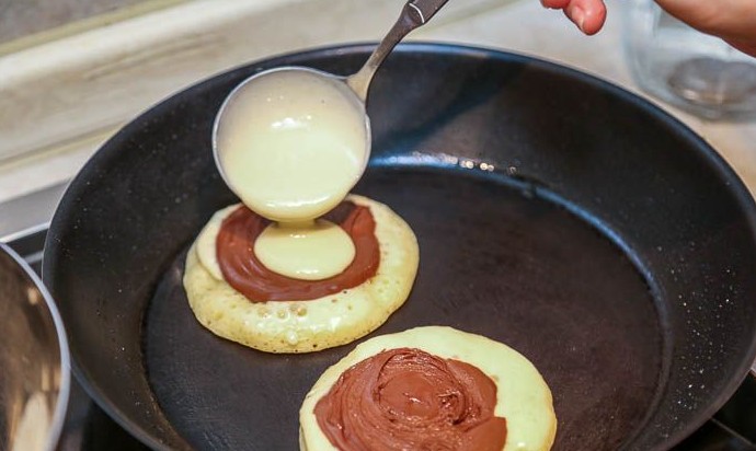 Перевернуть оладьи и печь до готовности с обратной стороны. Повторить все то же самое с остальными замороженными медальонами из шоколадной пасты и тесто. У вас получится 7 оладушек с секретом - с прослойкой шоколада внутри. Оладьи с нутеллой внутри подавать сразу же. Пока они горячие. Приятного аппетита!
