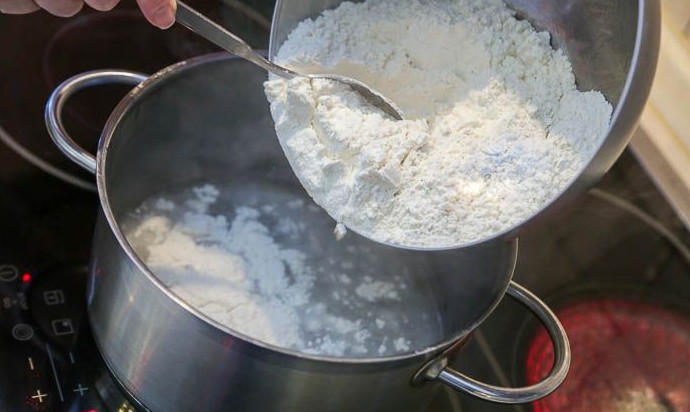 Засыпать в кипяток примерно четверть от всего объема муки и хорошенько вымесить.