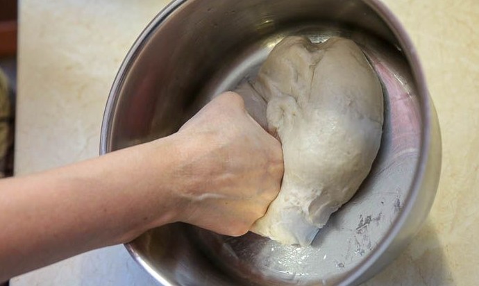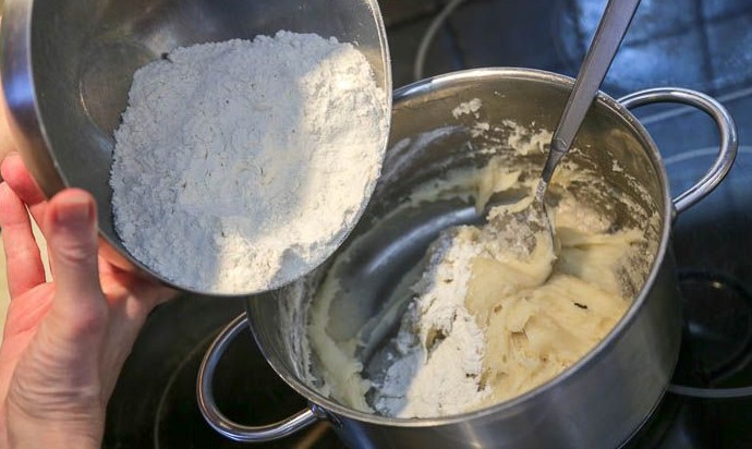 Когда заваренная мука немного остынет, по частям добавлять оставшуюся муку, вымешивая мягкое, эластичное тесто.