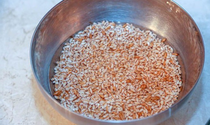 Полбу промыть под холодной проточной водой, откинуть на сито и дать воде полностью стечь.